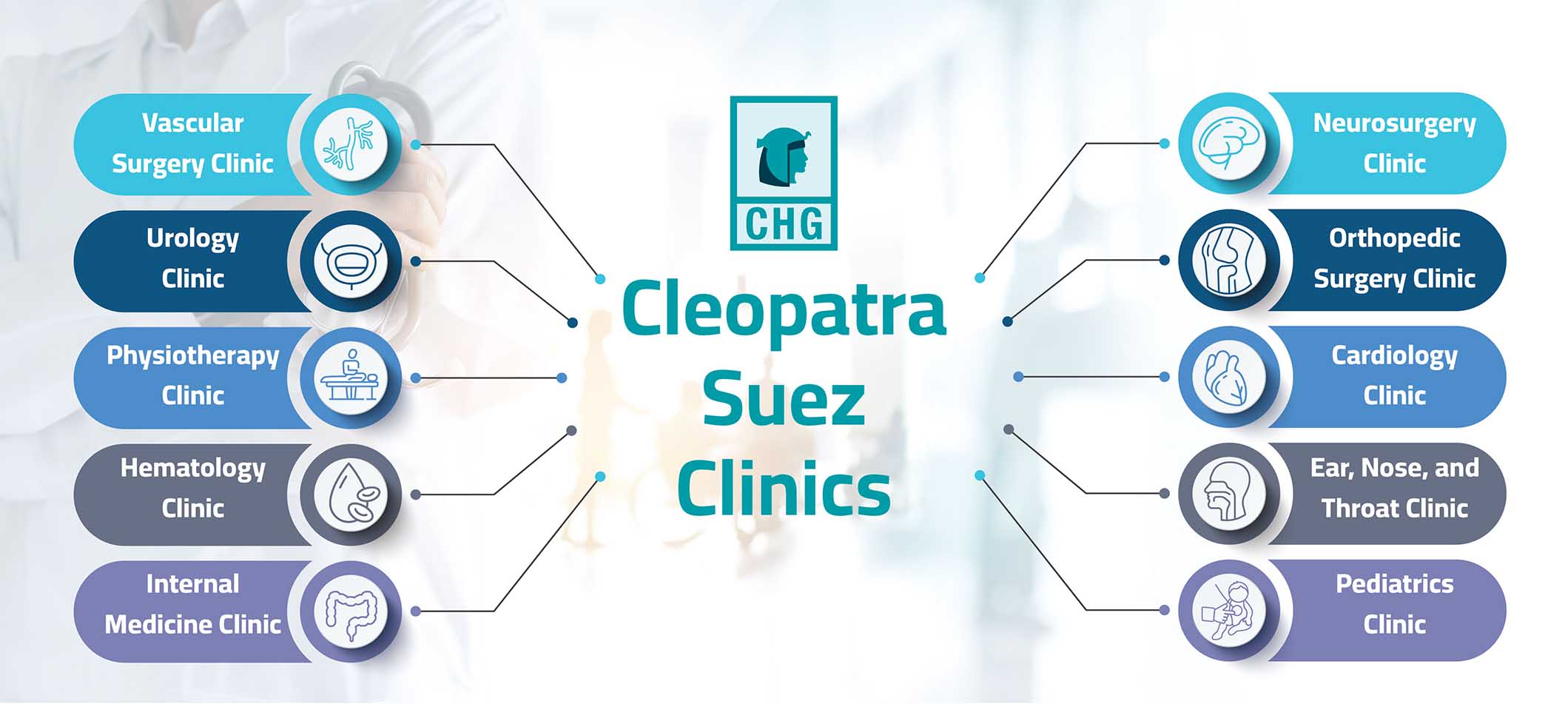 في جميع عيادات مجموعة مستشفيات كليوباترا، هدفنا هو تزويد المرضى وعائلاتهم بخدمة آمنة و متكامله من خلال الرعاية الطبيه الشامله مع نخبه من افضل الاستشاريين التي تضع المريض و جميع احتيجاته في المقام الأول. كجزء من مجموعة مستشفيات كليوباترا، يتاح لجميع المرضي استكمال علاجهم في مستشفى القاهره التخصصى و باقى مستشفيات المجموعة في القاهرة الكبري بسهولة من خلال النظام الرقمي الموحد حسب رغبة المريض أو في حالة احتياجه لخدمات طبية أو جراحيه اضافيه.